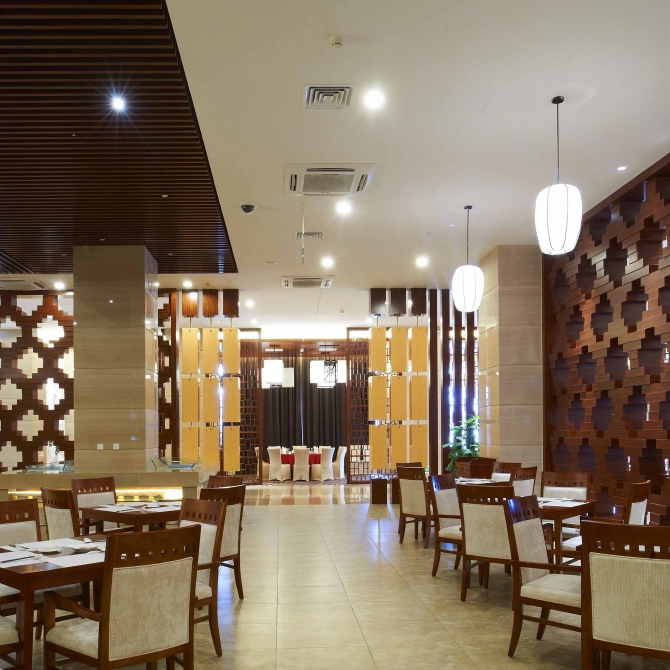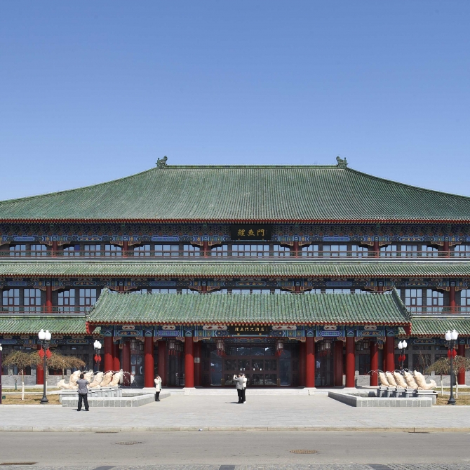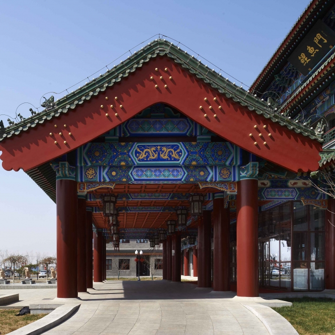 本項目建筑風格為仿明清北方傳統中式古建筑,主體為三層廡殿建筑,兩側為兩層硬山與三層歇山建筑,采用中心對稱的手法,主入口與望海樓遙相呼應。商務中心包括餐飲、會議及客房,形式規整。