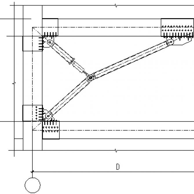 方案結合工程特點及要求,最終采用消能減震方案對原結構進行改造,通過合理布置消能器,為結構附加阻尼,耗散地震能量。為使結構的地震影響系數降低到原來的50%以內,達到降低抗震設防烈度1度(即8度)采取抗震構造措施的目的,工程中采用了“下肘節”式阻尼器放大裝置,在保證減震效果的同時提高單個阻尼器的工作效率。最終避免了原結構的大面積、大范圍的加固工作,順利推進了項目的開展。