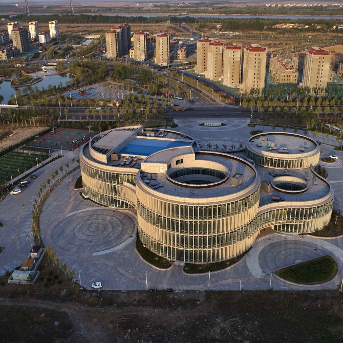 利津文化藝術(shù)中心方案意向為玉璧睡蓮。設(shè)計中每一個組合單元都采用圓形構(gòu)圖,根據(jù)建筑功能的不同,圓形有大有小,高低錯落,變化豐富。同時基地臨水現(xiàn)狀,寬闊的水面上簇擁著幾朵睡蓮,她們大小相宜,生動活潑,彰顯了文化中心的建筑性格。圓形建筑體塊的組合方式源于河邊的睡蓮,使每個功能單元既有聯(lián)系有各自獨立。