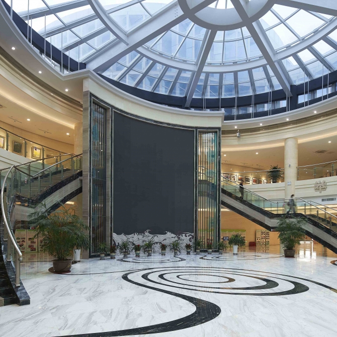 公共大廳。共兩層,中間為上下通透的共享空間,將劇院、圖書館、文化館緊密的結(jié)合在一起,使得各個場館既獨立有相互聯(lián)系。