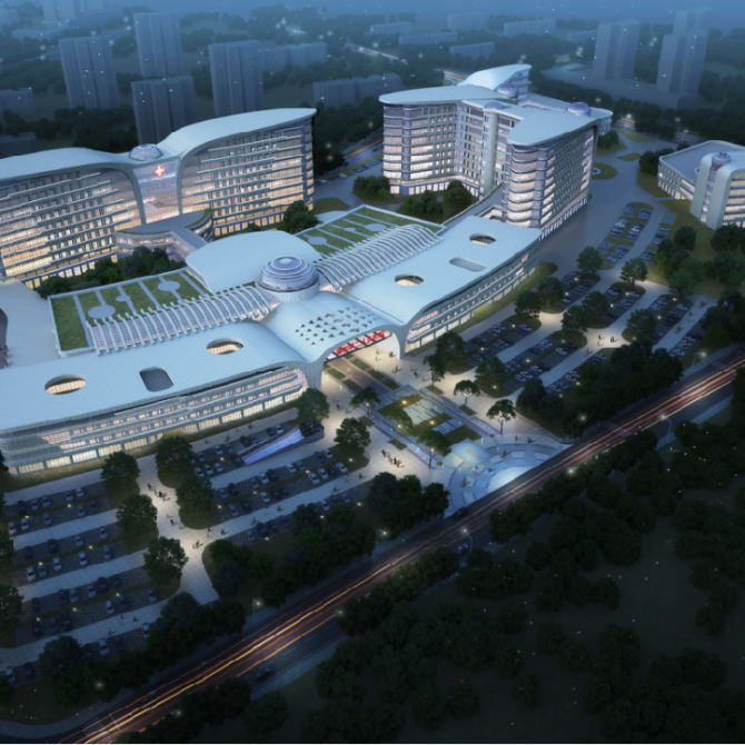 總平面流線組織上,充分考慮了潔污分區(qū)、動靜分區(qū)的設(shè)計需求。做到了潔污流線不交叉,醫(yī)護和病患流線不交叉,特別是將傳染病科室獨立布置于場地最東側(cè),最大限度地將傳染病人流線獨立出來。功能組織上,將醫(yī)技、門診、急診和住院大樓有機地結(jié)合起來,以醫(yī)療街為交通核心,將功能以盡可能短的路線銜接,做到最大限度的“節(jié)地”和“共享”。在建設(shè)時序上,以宏觀的動態(tài)的視角統(tǒng)籌規(guī)劃設(shè)計,保證二期住院樓部分建設(shè)前后的院區(qū)的便捷使用,保證在各個時序上建筑組群的形態(tài)和立面的和諧美觀。