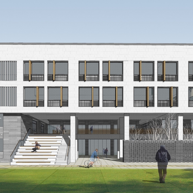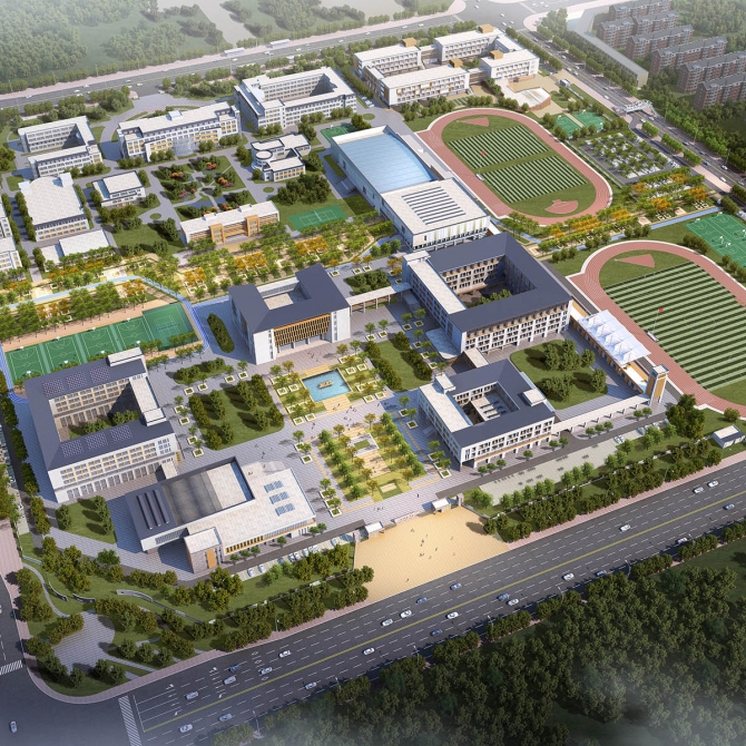 在設計中,我們以現代書院為設計主題,以院落為空間結構組織基本元素,設置“學術禮儀軸”和 “綠色共享軸”統領整個空間格局。學術禮儀軸貫穿南北,串聯起園區中的重要禮儀節點,是對老一中校園的延續,同時加以提煉、整合、烘托,新老相依,渾然一體,成為教育園區精神文化體現的禮儀軸線。綠色共享軸串聯南北,以林蔭大道為設計主體,輔以慢跑道、小球場、活動場地的設置,使其成為園區內各個學部共享的“校園綠肺”。