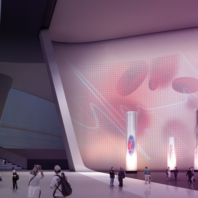 展示中心內部仿佛蘊藏著無限奧秘的“醫學秘境”,簡潔的建筑表皮下蘊含著精彩豐富的室內空間,充滿趣味和變化。本項目總建筑面積80000平方米,其中地上57000平方米,地下23000平方米,包含醫學科學創新體驗、醫學科學成果展示、濟南醫學科學城規劃與園區成果展示、醫學會議交流、醫學研究、創新孵化、醫學多功能展示服務等功能空間,是一個具有復合性、標志性和示范性的醫學科學體驗展示中心。