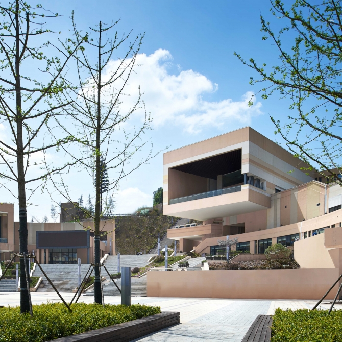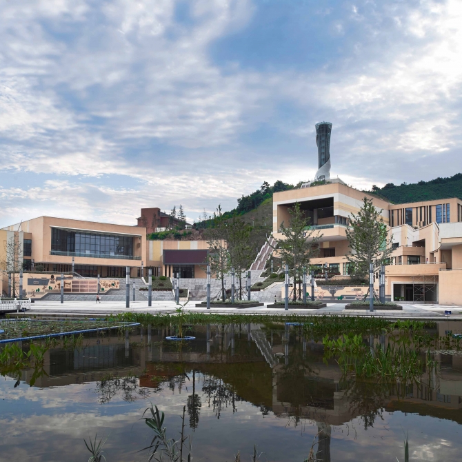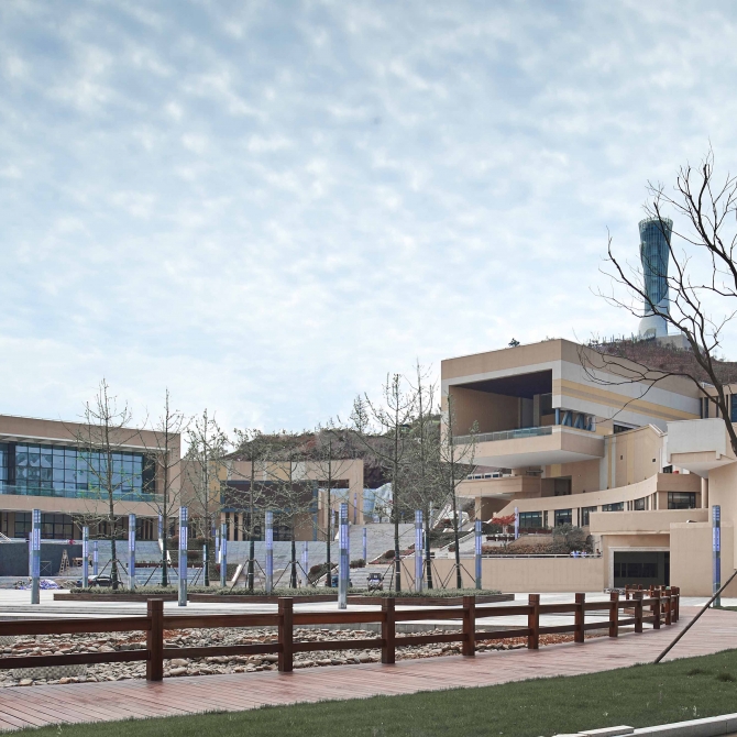 學生活動中心建設用地位于園區的東西主軸線與南北景觀大道交叉點上,風景宜人,處于園區的最佳位置,可供整個園區學生使用,風景宜人。北側國際學校區,南側普通教學區,東側景觀大道,西側為自然山體。總體地勢呈西高東低,東西高差9m。