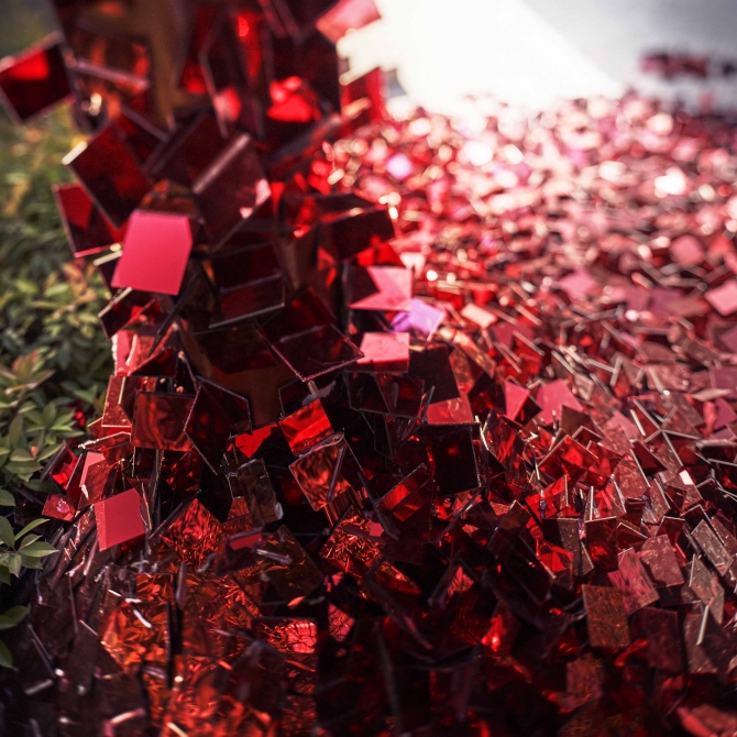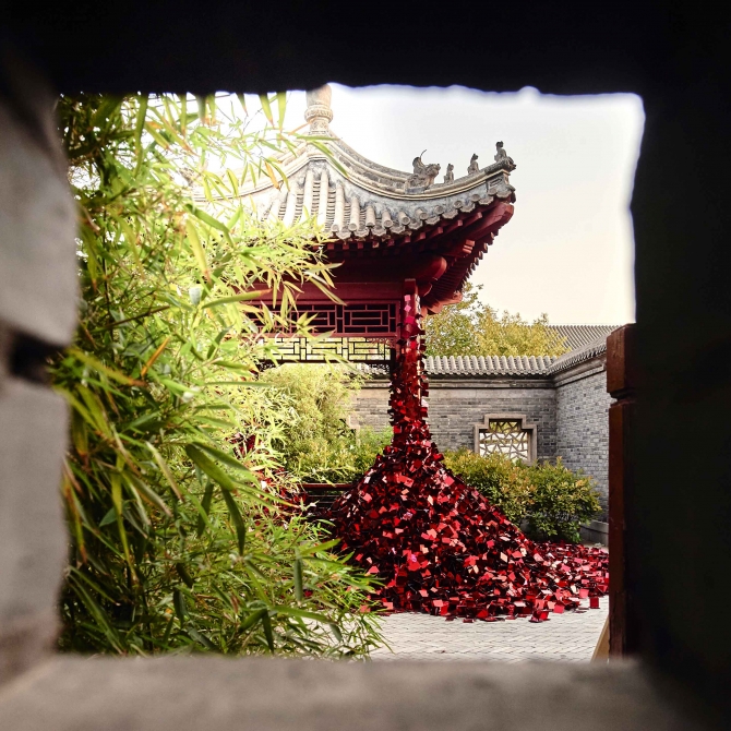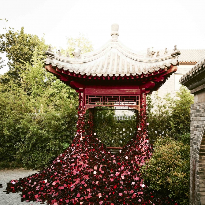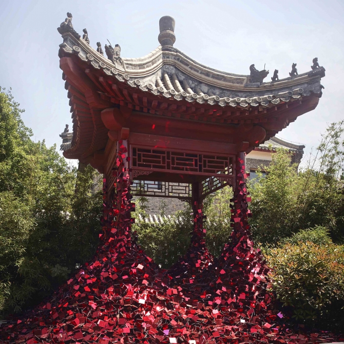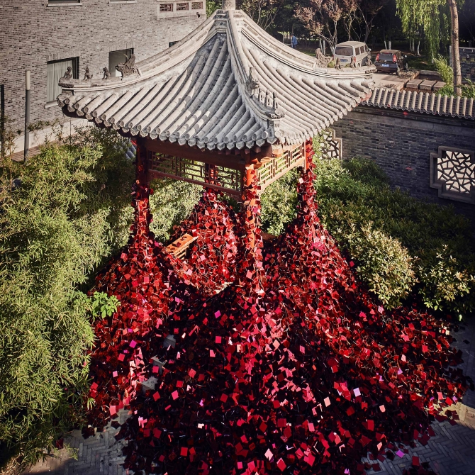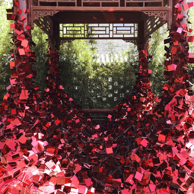 紅亭子是顧志宏工作室在2017年天津國際設計周上的一個作品,我們利用四萬個閃光的碎片改造了天津北寧公園的一個紅亭子,體現了設計師對如何繼承中國傳統文化的思考。正是這種強烈的社會擔當、思考、糾結和困惑,促成了這樣一個作品,進而借助這個作品表達出對繼承傳統文化的思考和使命擔當。