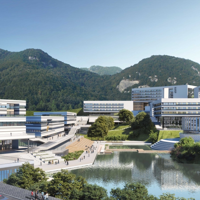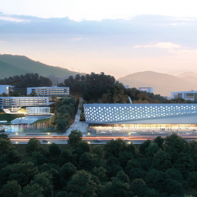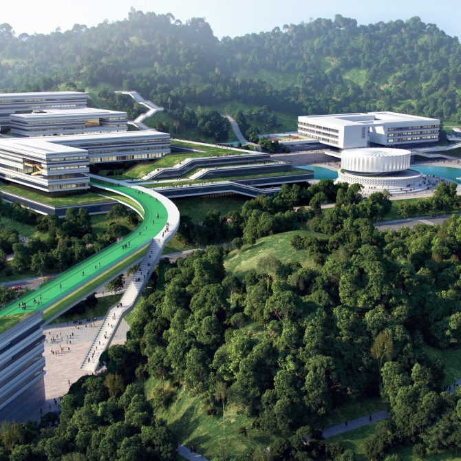 北側的教學生活區為學校的主體功能空間,建設用地沿外環路橫向展開,“一核兩園 展翼齊飛”的規劃格局,將使這里成為電力科技知識的殿堂,也成為學生美好校園生活的空間載體。“一核”, 為學術共享核,“工匠精神”大講堂及圖文中心位于校園中央,“能量環”的設計理念助力它成為整個校園的精神高地和學術燈塔。綜合實訓、基礎教學、公共創新實驗中心在大講堂西側沿山體帶狀展開。行政接待中心及電力科技博物館位于入口東側。整個學術共享核心建筑群結合山體臺地拾級而上,烘托出巍巍學府氣息。“兩園”為東西學生生活園,“西園”是由電力工程學院的學生生活、專業實訓、餐飲服務以及主體育場和學生文體活動中心共同組成,圍繞自然山谷的山水環境,創造出美好而有趣的山地校園生活空間。“東園”是由動力、信息、經管等綜合學科組團的學生生活、專業實訓以及輔體育場共同組成。東西兩園分別連接南側的校企互動建筑群與公共教學實訓區,形成適合山地校園地形特征,經濟合理,并且符合動態生長、分期建設策略的帶狀展開的校園建筑群,創造出“一核兩園 展翼齊飛”的整體校園空間態勢。