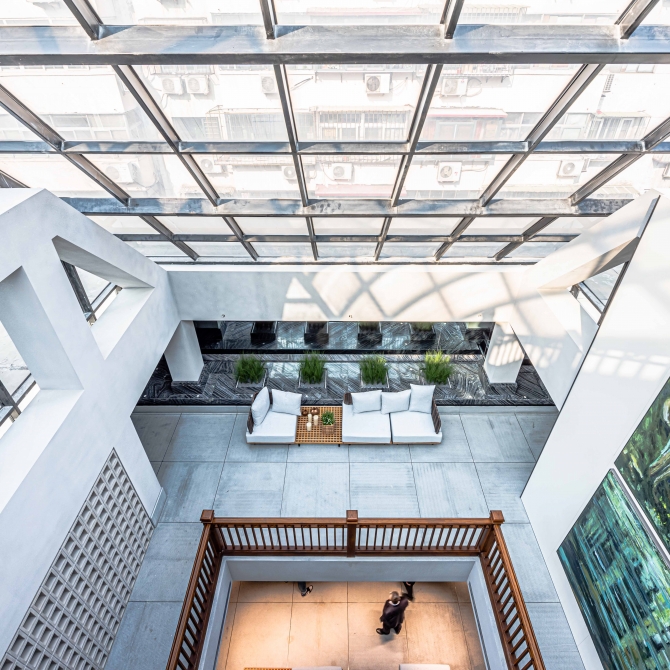 除了對主樓進行常規的結構加固、修繕以外,我院創新采用膠合木結構對地震時損毀的主樓坡屋頂及八角涼亭進行了復原設計,恢復其歷史樣貌的同時將復原的屋頂內部空間打造為企業家俱樂部。在主樓和后樓間使用玻璃連廊進行連接,進一步增加了使用面積和公共空間。